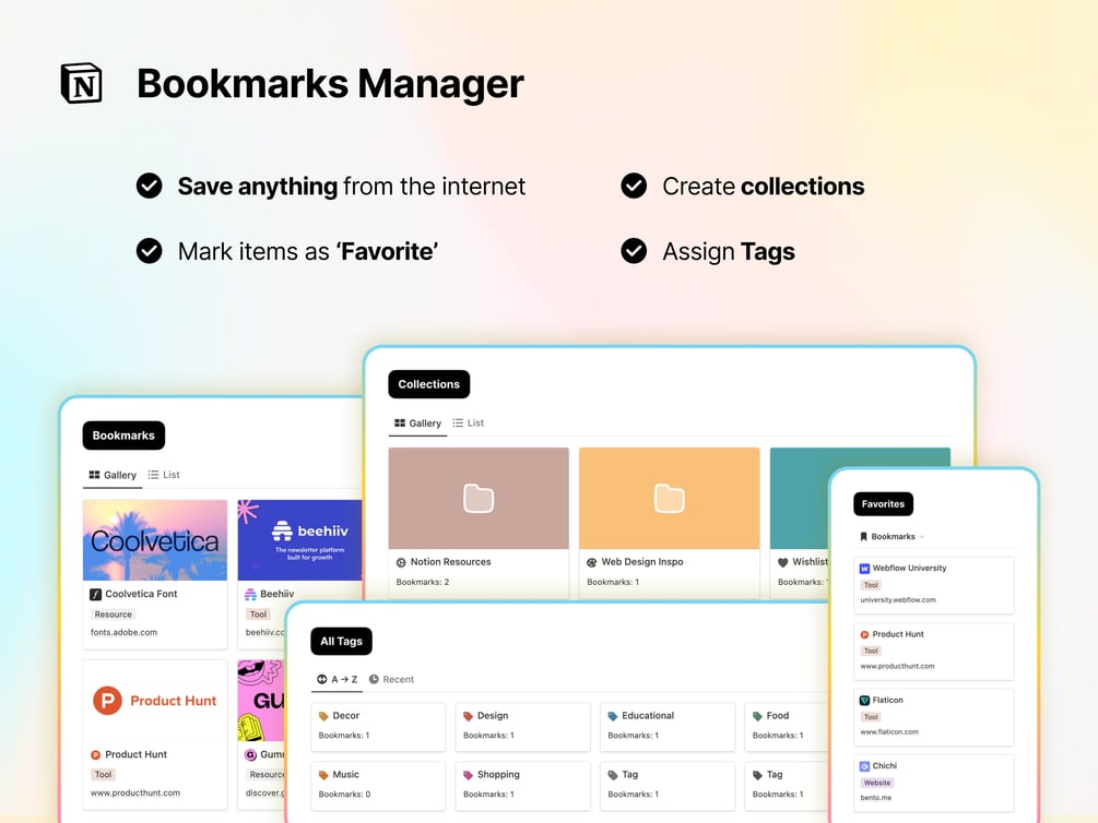 Add relevant tags to your bookmarks to always find what youโre looking for. (#food, #webflow, #summer, etc.)