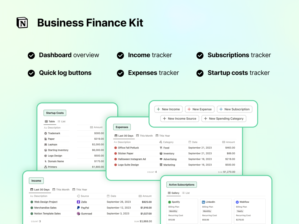 - A summary overview of business finances (income, expenses, spending categories/budgets, active subscriptions) from the current month and year.