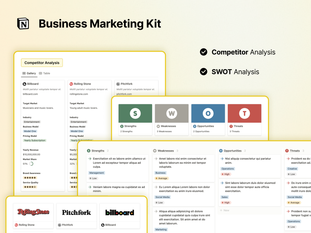 Define your business' target audience, outline marketing strategies, plan social media content, analyze competitors, manage ads, and more!