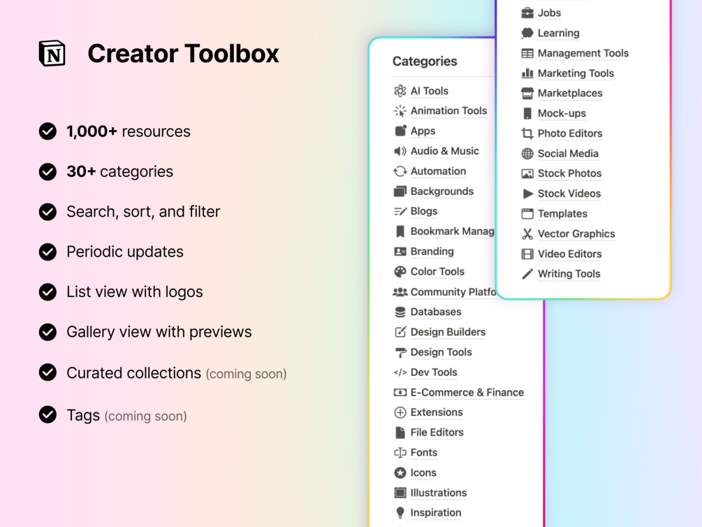 I noticed how extensive my collection was becoming and thought it could be of use to other creators. Find everything from color tools, design tools, writing tools, and font sites to learning tools, community platforms, management tools, and more.